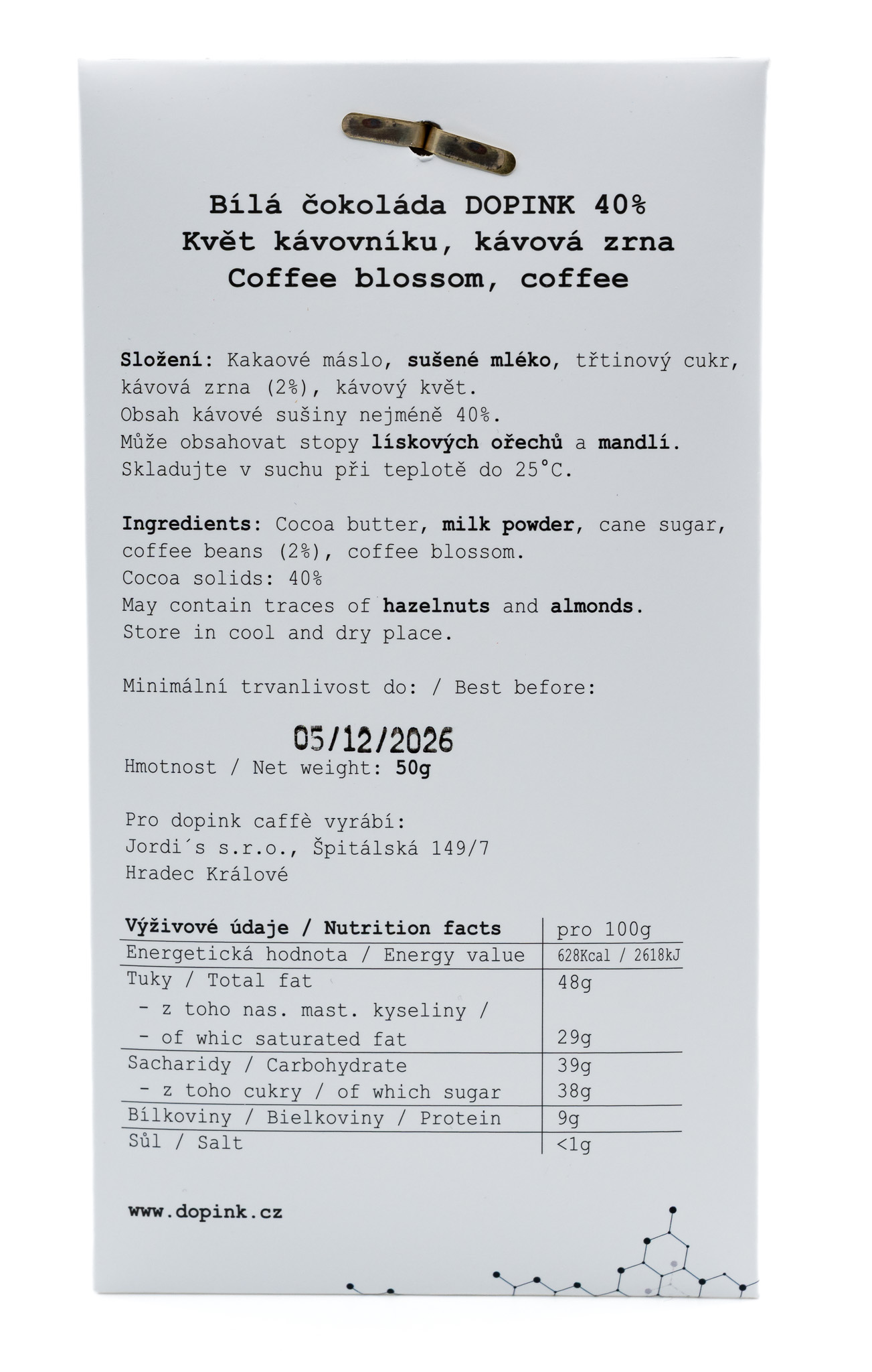 Bílá 40% čokoláda s praženu kávou z Etiopie